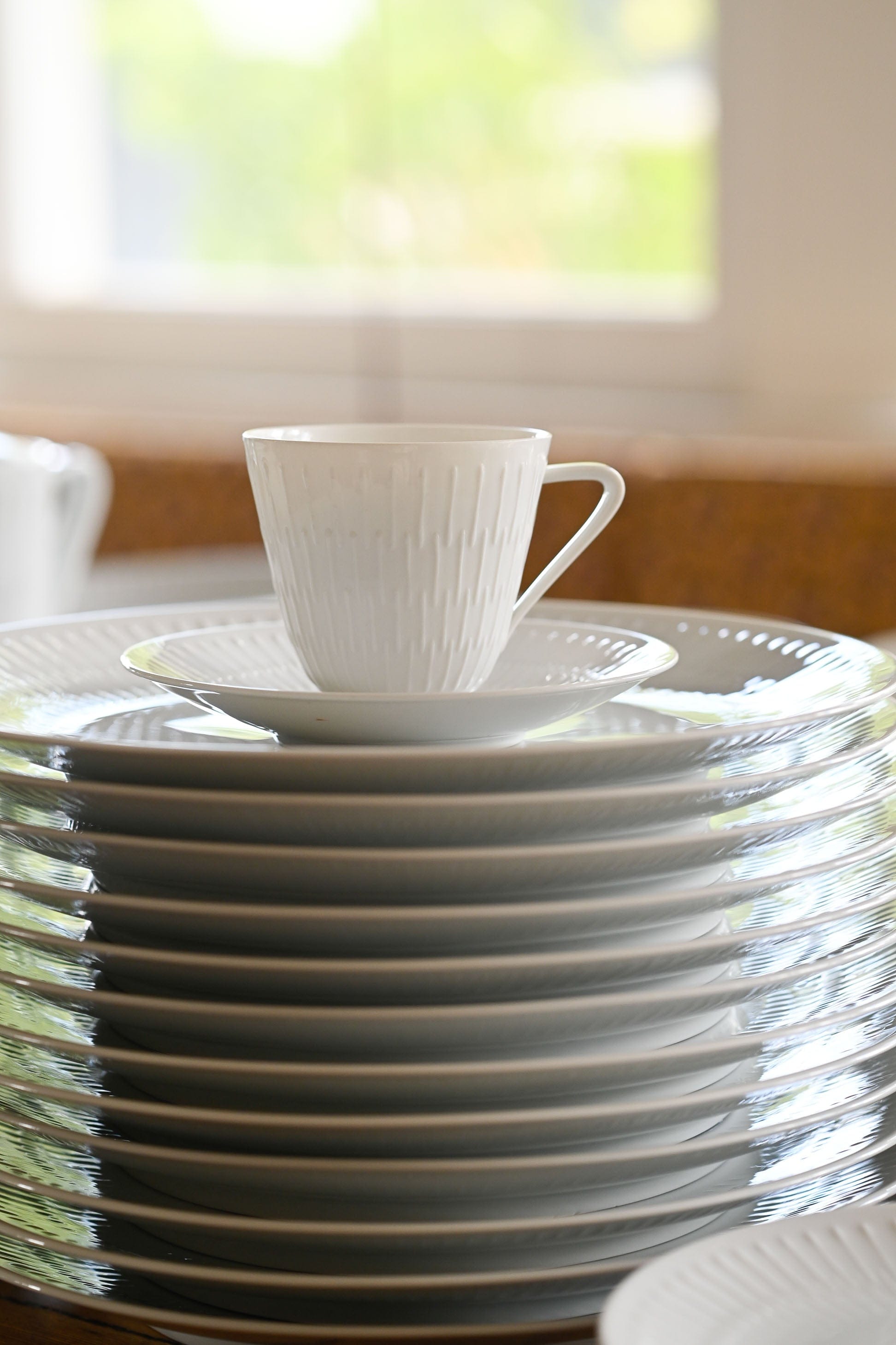 This mid century set is a fine white porcelain with raised lines in white. It has a timeless, minimal mid century style